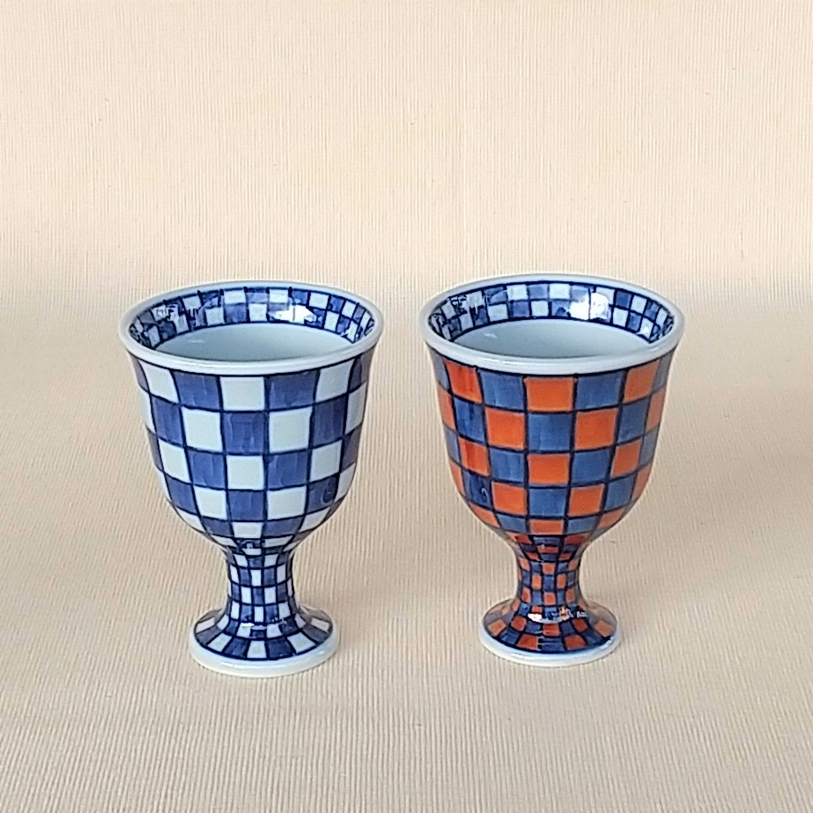 伐太郎窯作、染付市松の高台食前酒盃になります。